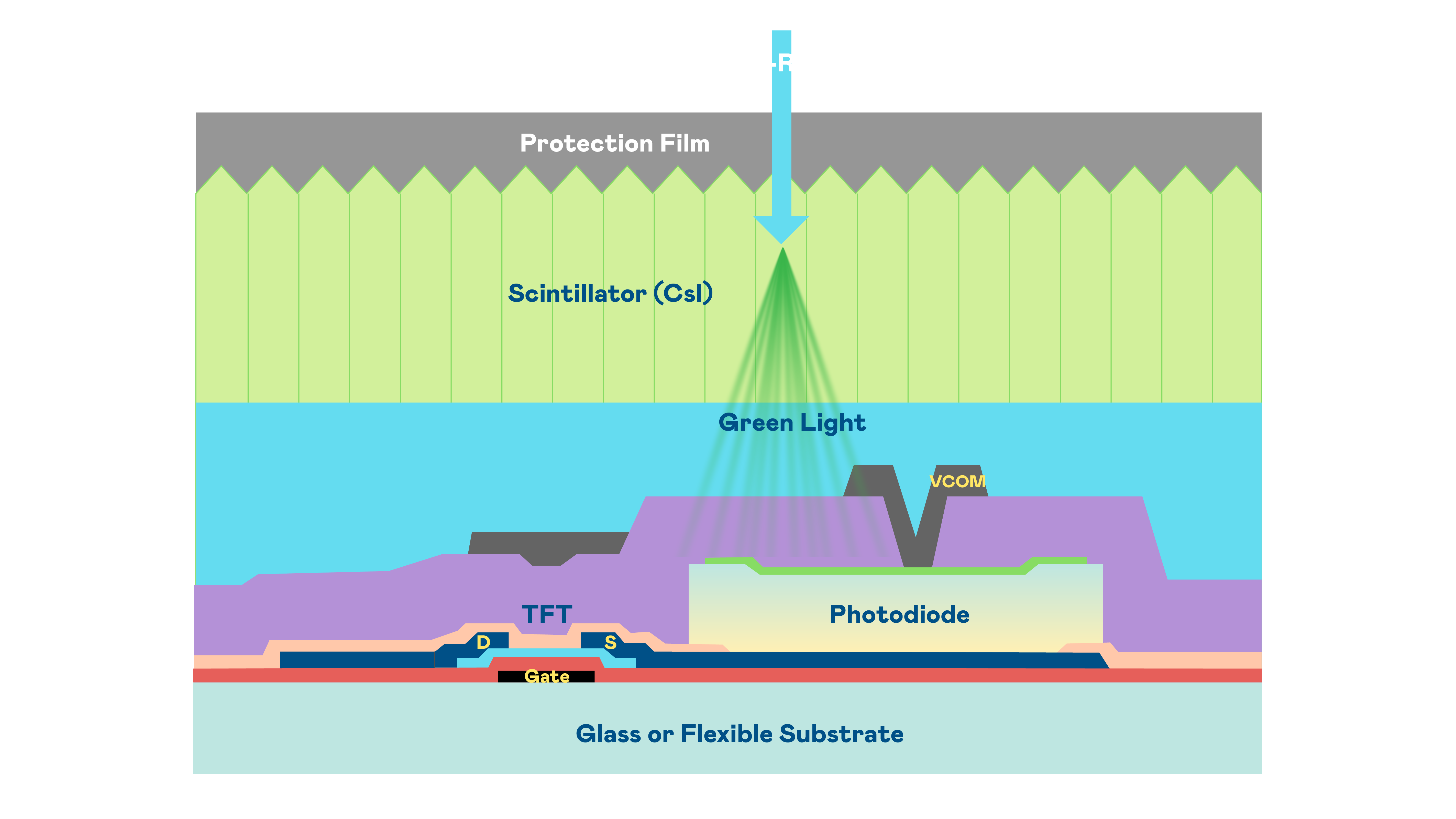 九州酷游的X光影像感测阵列使用薄膜电晶体 (TFT) 作为每个像素的读取开关,搭配光电二极体(Photodiode)的光电转换元件,用以感测X光影像讯号。